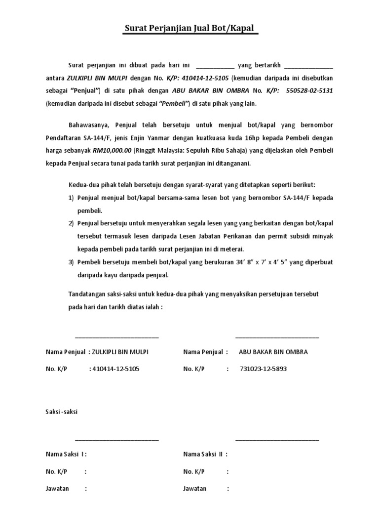 Surat Perjanjian Jual Beli Kereta Kaedah Doc Surat Perjanjian Jual Beli Kereta Kaedah Sambung Bayar 1 Bahawasanya Surat Perjanjian Ini Diperbuat Pada Course Hero from www.coursehero.com Berikut ini adalah contoh surat perjanjian jual beli terutama kapal, contoh ini sudah disesuaikan dengan materi sma kelas 2full description. Surat perjanjian jual beli merupakan sebuah surat yang dibuat oleh pihak yang saling terlibat dalam suatu transaksi jual beli harta benda yang memiliki nilai harga yang relatif. Bukti transaksi dibuat berdasarkan nilai dari barang yang diperjualbelikan. Hal ini dikarenakan jika suatu hari nanti timbul sebuah. Objek yang diperjualbelikan dapat berupa objek bergerak berupa dan tidak bergerak, contohnya jika hendak membeli hunian maka kamu perlu surat perjanjian jual beli rumah. Contoh surat perjanjian hutang piutang. Contoh surat perjanjian ini berisi penyerahan tanah dari penjual ke pembeli serta berhak menerima. Jika anda pergi ke pasar dan berbelanja kebutuhan rumah.